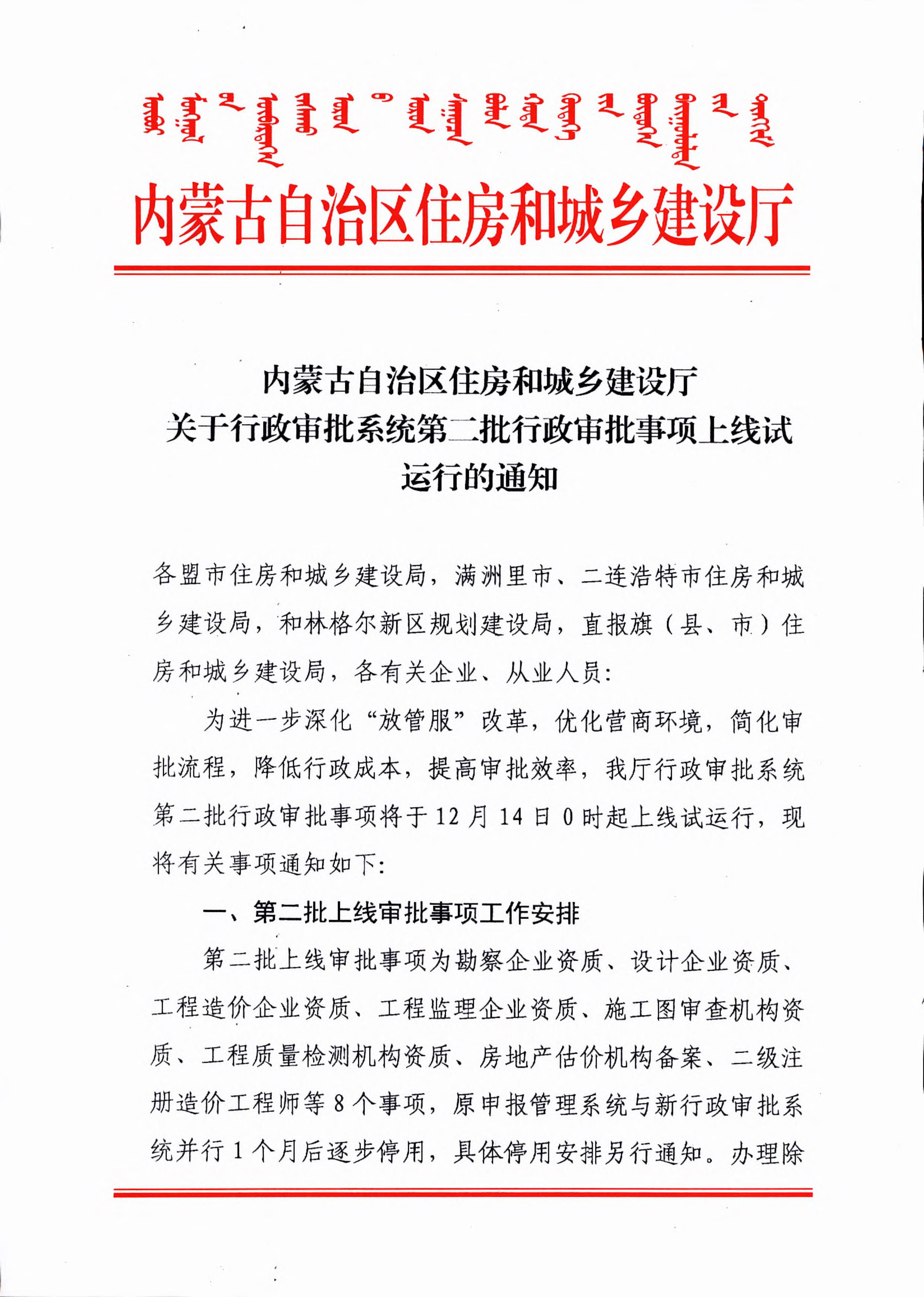 內(nèi)蒙古自治區(qū)住房和城鄉(xiāng)建設(shè)廳關(guān)于行政審批系統(tǒng)第二批行政審批事項上線試運行的通知