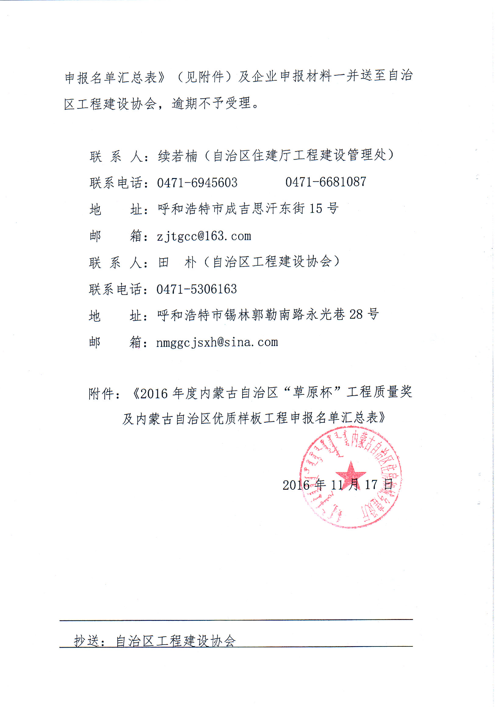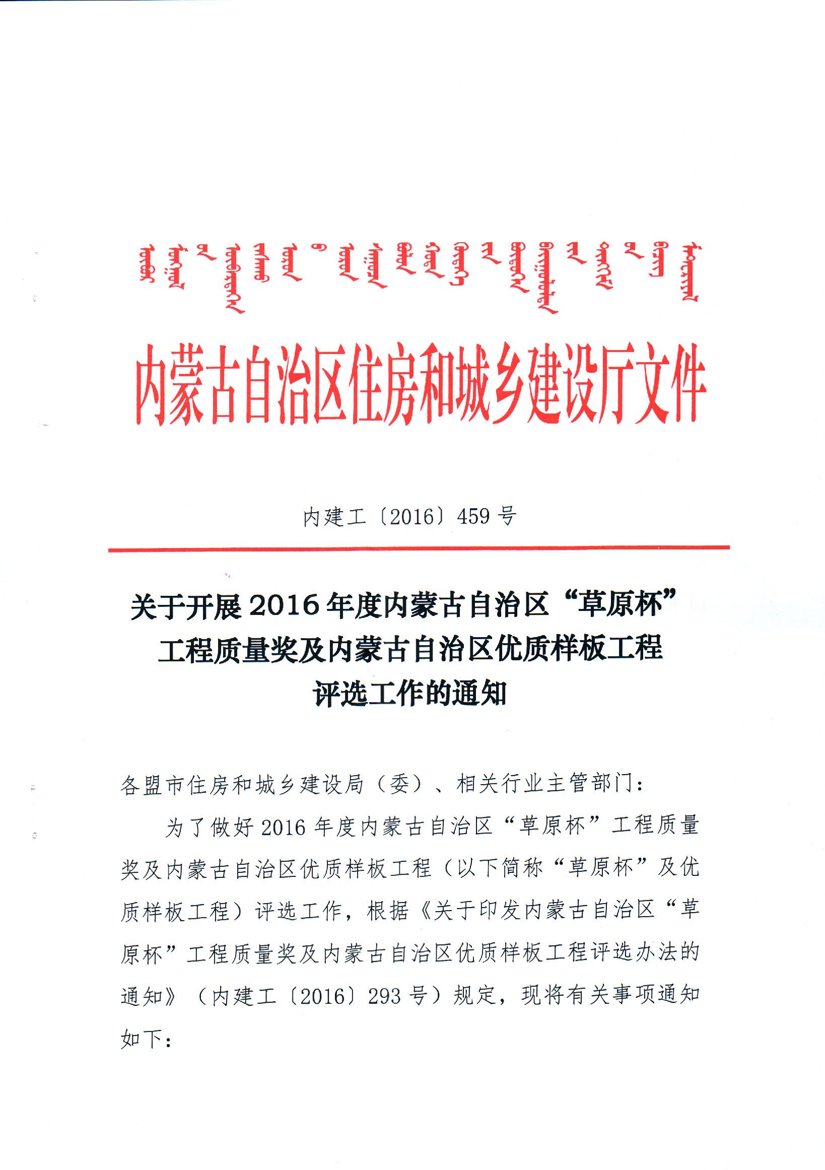 關于開展2016年度內蒙古自治區(qū)“草原杯”工程質量獎及內蒙古自治區(qū)優(yōu)質樣板工程評選工作的通知